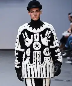 Arctic- and Inuit-inspired clothing became trendy again in 1960s fashion, with the increased popularity of sportswear as fashion.[186] Fashion photographs of these looks often included tropes of exoticism, savagery, and barbarianism, perpetuating the dominant Southern view of Indigenous peoples as uncivilized.[186] Snow goggles, an Inuit device for protecting the eyes from snow blindness, were also interpreted by Southern designers during this era. French designer André Courrèges paired white plastic versions with his Space Age fashion.[187] During the 1990s, Inuit-inspired clothing returned to prominence.[188] French designer Jean Paul Gaultier and American designer Isaac Mizrahi both released collections which incorporated Inuit concepts for Fall/Winter 1994, titled Le Grande Voyage and Nanook of the North, respectively.[188] Icelandic artist Björk walked the runway for Voyage in a jacket made of fur and skins.[188] Mizrahi's collection paired parkas and furs with voluminous, brightly-colored evening gowns.[189]