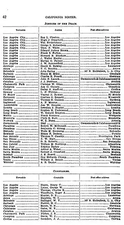 Townships in California have never developed as real units of local government. Since the California constitution of 1879, they have instead lost all functions other than those of a minor judicial nature.[2] Government functions that elsewhere in the United States might fall to the township in California are the responsibility of various special purpose districts.[2] The main purpose of townships in California since 1879 is the "judicial township" which employs justices of the peace and constables.[3][4] However townships were also used for organizing election precincts[5] and federal census enumeration.[6]