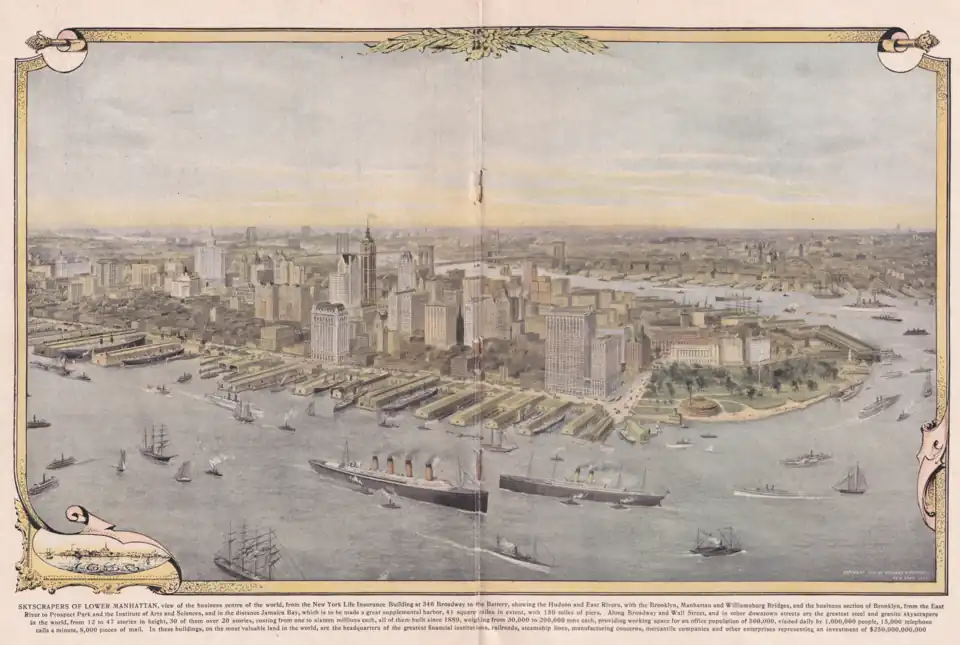 Manhattan in 1873, looking north. The Hudson River is at left. The Brooklyn Bridge across the East River (at right) was built from 1870 to 1883.