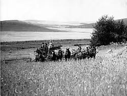 The Inland Northwest region has also long been associated with farming, especially wheat production where it is one of the largest wheat producing regions in the United States.[76] Initially, the Palouse region to the south of Spokane was thought to be not suited for wheat production due to the hilly terrain, believing wheat could not be cultivated on the tops of the hills, but the region showed great promise for wheat production when it began in the late 1850s in part due to the hilltops.[76] Agricultural potential and productivity depends greatly on a region's soil qualities which in turn is dependent on the climate and amount and timing of rainfall events.[77] The Inland Empire, with its cool, snowy and rainy winters, rainy spring, and hot and dry summers lends itself to a wide variety of farming.[78] The commercial farming activities were greatly enhanced by the founding of two state land-grant universities, Washington State University (as the Agriculture College, Experiment Station and School of Science of the State of Washington) in Pullman and the University of Idaho eight miles away in Moscow, Idaho.[79] The strategically placed universities and their experiment stations and staff would help the industry by improving farm management, conducting research, and teaching students to be better, more competent farmers.[79] Industry innovators such as William Jasper Spillman (1863-1931) and later Orville Vogel (1907-1991) and others would make significant contributions and observations to the widen the knowledge of agriculture, horticulture and farm management and animal science with applications for the region and around the world.[80]