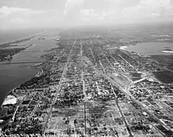 The buildings used by The Palm Beach Post and the Palm Beach Times suffered severe damage, though both companies continued to publish newspapers with little interruption.[47][48][49] The Central Farmers Trust Company, the city's only bank, was deroofed and flooded.[37] Prior to the storm, the American Legion building was designated as the headquarters for the Red Cross, but the building was severely damaged, forcing the Red Cross to relocate its relief post to another building.[42] At Palm Beach High School, then located where the Dreyfoos School of the Arts stands today, the clock tower collapsed.[50] The storm deroofed most buildings at Saint Ann's Catholic Church,[51] while Bradley Hall Towers suffered total destruction.[52] At Flamingo Park, one of the worst hit areas of the city, many homes suffered damage, while a shopping center on Lake Avenue experienced near complete destruction. In contrast, the El Cid and Northwood neighborhoods generally experienced only superficial impact. Fallen pine trees blocked many streets in Vedado. At Bacon Park, the area west of Parker Avenue was desolate.[53]