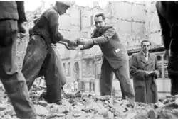 Bricks from destroyed or only slightly damaged buildings were collected by the Independent Debris Removal Unit and the Municipal Demolition Enterprise.[13] The most well-known and articulated line of tracks was established at the end of 1947. It began at the Świebodzki Station and ended near the New Town.[14] Bricks were transported by train to the east, beyond the pre-war Polish border, where they were intended for the reconstruction of Polish cities – Warsaw being the primary propagandistic goal.[15] However, the shipments also went to the construction of Nowa Huta.[16] Some demolition bricks were illegally sold on-site by corrupt officials, some of whom were later sentenced.[13] The city was also looted by Soviet soldiers, who took artworks, factory equipment, etc.[17] Wrocław suffered from frequent fires, some of which were deliberately set.[18]