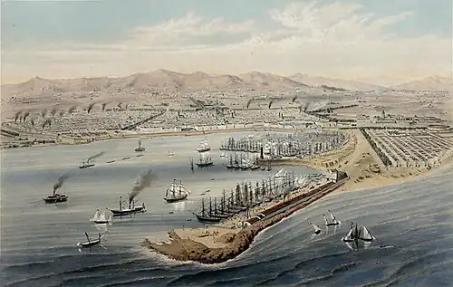 The number of boats laden with raw cotton arriving in Barcelona from America skyrocketed from 12 in 1827 to 65 in 1835 to 197 in 1840, the vast majority from Cuba and Puerto Rico.[60] By 1848, 11,000 tonnes of raw cotton were being used, five times more than in 1820.[61] While in 1840 the majority of machinery was still turned by hand, at the end of the 1850s, almost 75% of spinning and 50% of looms were turned by steam engines.[62]