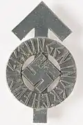 The badge was numbered on the reverse and is similar in appearance to the standard badge, but edged in gilt rather than silver.[6] The right to wear the Golden Hitler Youth Badge continued after the recipient left the Hitler Youth and no longer wore the uniform. The Leader of the National Hitler Youth could grant the right for the recipient to wear the badge indefinitely.[5]