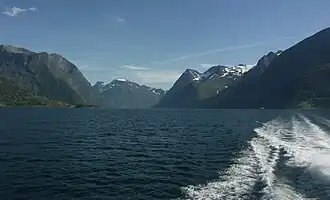 Hjørundfjorden[1] is a fjord in the traditional district of Sunnmøre in Møre og Romsdal county, Norway. It is located mostly within Ørsta Municipality, although part of the mouth of the fjord lies in Sykkylven Municipality and the innermost part of the fjord lies in Volda Municipality. The 20-kilometre (12 mi) long fjord is an arm off of the larger Storfjorden. Villages along the shores of the fjord include Molaupen, Hundeidvik, Trandal, Sæbø, and Store-Standal.[2]