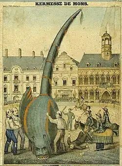 Also known as the "Doudou", the Ducasse de Mons is a festival that takes place on Trinity Sunday in the town of Mons and consists of two parts. The first is a procession with the shrine of Saint Waltrude. The second part, called the Lumeçon, depicts the combat of St George and the Dragon and features a large processional dragon with an enormously long, stiff tail. Saint George's attempts to kill the dragon with his lance all fail, so he then dispatches it with a pistol. An illustration from the 19th century clearly shows the dragon with three hobby-horses of the "tourney" type, but modern photographs and descriptions of the event show these animals are made of cow-hide and look more like dogs; they are known as Chinchins or Chins-Chins (a corruption of chien, dog) and their role is to aid St. George.[31]