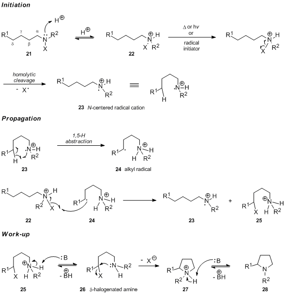 It is generally accepted that the first step in the Hofmann–Löffler–Freytag reaction conducted in acidic medium is the protonation of the N-halogenated amine 21 to form the corresponding N-halogenated ammonium salt 22. In case of thermal or chemical initiation of the free radical chain reaction, the N-halogenated ammonium salt 22 undergoes homolytic cleavage of the nitrogen-halogen bond to generate the nitrogen-centered radical cation 23. In contrast, it has been argued that the UV light-catalyzed initiation involves the free form of the N-haloamine and a rapid protonation of the newly generated neutral nitrogen radical (see the section devoted to mechanistic studies for arguments supporting this statement). Intramolecular 1,5-hydrogen atom transfer produces carbon-centered radical 24, which subsequently abstracts a halogen atom from the N-halogenated ammonium salt 22. This affords the protonated δ-halogenated amine 25 and regenerates the nitrogen-centered radical cation 23, the chain carrier of the reaction. Upon treatment with base, 25 undergoes deprotonation followed by an intramolecular SN2 reaction to yield pyrrolidine 28 via intermediate 27.
