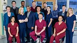 Camilla Arfwedson reprises her role as Zosia March for the opening episode.[67] After taking a break from the serial in the previous series, Catherine Russell returns to her role as consultant general surgeon and clinical lead of the AAU Serena Campbell in episode 6.[68][8] Marcus Griffiths joins the cast as registrar Xavier "Zav" Duval in episode 8.[10] Jemma Redgrave also left her role as Bernie Wolfe during the previous series, although producer Hall confirmed that she would return when she decided to end her break.[57] Russell confirmed on 6 February 2018 that Redgrave would film several episodes in March,[69] and Bernie returns in episode 24 for two episodes.[70] Redgrave reprises her role again for episodes 49 and 50.[51][52] Olivia Poulet joins the semi-regular cast as chief executive officer and consultant cardiothoracic surgeon Abigail Tate in episode 14.[71] Abigail makes an off-screen exit in episode 45.[47] Debbie Chazen reprises her guest role as Fleur Fanshawe, now a consultant obstetrician, in episode 25.[72] Chazen last appeared in series 17.[73] In August 2018, it was announced that Chizzy Akudolu would return to the series for two months as consultant cardiothoracic surgeon Mo Effanga, having last appeared in 2017.[74] The following month, it was announced that John Michie would also reprise his role as consultant neurosurgeon Guy Self, over a year since his last appearance.[75] Both characters return in episode 47, the only episode that Guy appears in.[76] Ben Hull also returns to his role as Derwood Thompson in episode 52 for a single episode to aid the end of Mo's guest stint.[54]