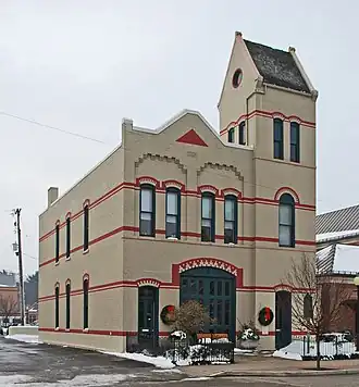 The building was substantially completed by the end of 1883, but some finishing was left in 1884. The building served as the city hall and fire station for the city until the 1910s, when a new city hall was constructed. Additions to the building were completed in 1941, and the building served as a fire station for the city until 1977, when a replacement was constructed. The building was soon thereafter sold to private investors, who renovated the structure.[2]