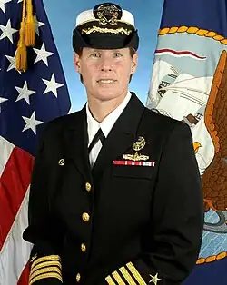 Graf's previous billets include Auxiliaries Officer and First Division Officer on the destroyer tender USS Puget Sound (AD-38), this due to combat restrictions in effect at the time (10 USC 6015) that precluded women from being eligible to serve on front-line combatant warships in the U.S. Navy.[7] With the termination of this restriction in 1993 and the first women embarking on warships in 1994, Graf subsequently became the Weapons Officer aboard the frigate USS Ainsworth (FF-1090) and executive officer of the guided missile destroyer USS Curtis Wilbur (DDG-54). She was subsequently promoted to commander and served as commanding officer of the guided missile destroyer USS Winston S. Churchill (DDG-81) from 20 April 2002 to 6 February 2004. During this deployment, she participated in the opening stages of Operation Iraqi Freedom. She was promoted to captain in 2007.[8] Graf then served as the assistant operations officer for the USS Carl Vinson (CVN-70) carrier strike group.