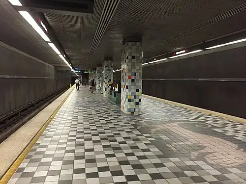 Hollywood/Western station has a single island platform oriented east–west under Hollywood Boulevard, with a mezzanine above. The single station entrance and elevator are located in a plaza on the southeast corner of the intersection.[5] The station was designed by Escudero–Fribourg Architects, while May Sun designed the interior finish and artworks, which reflect the neighborhood's immigrant heritage.[6] The walls and floors are covered by black, gray, and white tiles, with colorful highlights on the walls.[7] Armenian, Chinese, and Mayan symbols are depicted on granite pavers. Some wall panels display historic photographs of the neighborhood; others have depictions of fossils discovered during excavation of the station.[6] Sculptures of two Pacific Electric Red Cars hang over the platform from the mezzanine wall.[8]