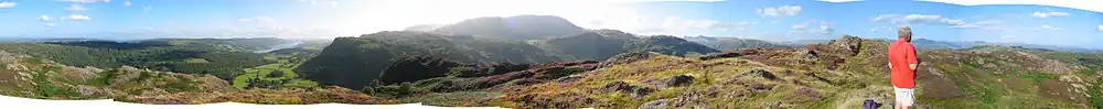 Despite its modest altitude, the hill's relative isolation means it commands good views to north, south and east, including almost the full length of Coniston Water, with Wetherlam and the rest of the Coniston fells blocking distant views in the south-western quadrant.[3][4]