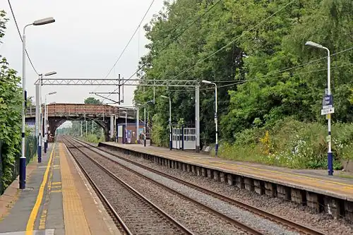 Holmes Chapel railway station serves the village of Holmes Chapel in Cheshire, England. It is located 8½ miles (14 km) north-east of Crewe on the Crewe to Manchester Line.