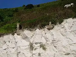 Weircombe Cottage is shown on higher ground to the east of the Pinnacle in the 1875 map. This seems to have had no connection with the fishermen's cottages.[2] During the inter-war years, it was occupied by the actress and singer Winifred Barnes (1892–1935), and her sister. The latter continued to live at the cottage after Winifred's death. By that time it was the property of the Council. Local auctioneers Edgar Horn cleared the cottage and sold the contents; a large amount of silver antiques were found in an outside lavatory before the cottage then only a few feet from the cliff edge was demolished in the late 1980s.