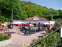 The pinnacle was formerly known locally as Gibraltar, and the ground around here was the site of lime kilns which were worked by the fishermen.[3] In 1905, the town council laid out a public garden, named somewhat loosely The Holywell Retreat, on the site of a disused chalk pit known as The Gore some 400 metres to the northeast of the Holywell fishing settlement. A tea chalet was later built in the garden and the area above was redesigned in the Italianate style after World War I to provide work for the unemployed.[3] The Council later erected beach chalets above the lower promenade. In 1935, one of the chalets was set aside for the use of King George V and Queen Mary during their visit to the town.[4] More chalets were constructed in the 1950s; as of 2009 there were 69 brick-built chalets available for annual rent.[5]