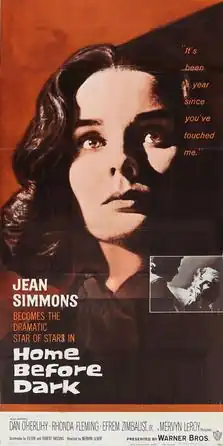 Home Before Dark is a 1958 American drama film directed and produced by Mervyn LeRoy and starring Jean Simmons, Dan O'Herlihy, Rhonda Fleming, and Efrem Zimbalist Jr.[3] The screenplay was written by Eileen and Robert Bassing, based on the novel by Eileen Bassing. The title song was written by Sammy Cahn with music by Jimmy McHugh.