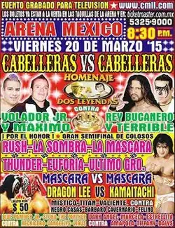 Homenaje a Dos Leyendas (2015) (Spanish for "Homage to Two Legends") was a professional wrestling supercard show event, scripted and produced by Consejo Mundial de Lucha Libre (CMLL; "World Wrestling Council"). The Dos Leyendas show took place on March 20, 2015 in CMLL's main venue, Arena México, Mexico City, Mexico. The event was to honor and remember CMLL founder Salvador Lutteroth, who died in March 1987. Starting in 1999 CMLL honored not just their founder during the show, but also a second lucha libre legend, making it their version of a Hall of Fame event. For the 2015 show CMLL commemorated the life and career of wrestler El Faraón. This was the 17th March show held under the Homenaje a Dos Leyendas name, having previously been known as Homenaje a Salvador Lutteroth from 1996 to 1998. The 2015 Dos Leyendas show was broadcast live in 60 Cinépolis theaters in Mexico, which was the first time this format was offered in Mexico.[2]