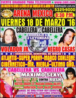- ^ a b "Resultados Homenaje a dos Leyedas: ¡Negro Casas y Máximo Sexy, Sin cabelleras!" (in Spanish). Consejo Mundial de Lucha Libre. March 19, 2016. Archived from the original on March 26, 2016. Retrieved March 19, 2016.