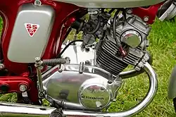 The SS125A had 17 inch wheels; the front rim was either 1.4 inches or 1.6 inches wide while the rear rim was 1.6 inches wide.[2] The 124 cc twin cylinder engine was basically same as the earlier CA95/CB92 layout, using the left side of the engine for the timing chain to the camshaft.[1] It used a Keihin Seiki vacuum carburetor, as opposed to the earlier engines, which were equipped with a slide valve type. The home market (Japan) version was built using a 180 degree crankshaft, as opposed to the 360 degree layout in the U.S.models.[3]