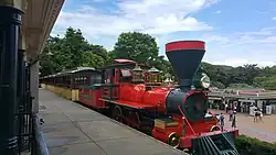 Unlike other railroads at Disneyland-style parks, where the trains are powered by actual steam locomotives, Hong Kong Disneyland's trains are powered by steam-outline locomotives, which are diesel locomotives with the outward appearance of steam locomotives.[1] This is due to Hong Kong's strict emissions standards, which also served as a cost-effective measure that obviated the need to build new steam locomotives, or the finding and transport to Hong Kong of suitable existing narrow gauge steam locomotives. As a result, in order to mimic the sound of an actual steam locomotive, typical steam audio (chuffing, steam whistle, etc.) are emitted from speakers installed on each locomotive. Despite the fact that they are not steam-powered, Dana Amendola, the author of All Aboard: The Wonderful World of Disney Trains, describes the locomotives as "a representation of the golden age of railroading."[1]