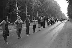 The action was inspired by a similar event that occurred 30 years before, on 23 August 1989.[11] The Baltic Way involved two million people in a human chain across 675 kilometres that linked the capitals of Estonia, Latvia, and Lithuania, serving as a call for restoration of independence from the Soviet Union.[9] On 11 March 1990, within seven months of the Baltic Way, Lithuania became the first Soviet state to declare independence.