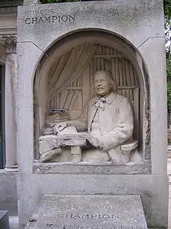 Champion died from an embolism on 8 April 1913 in his apartment at 30 rue Jacob, Paris.[2] His tomb, located at the Montparnasse Cemetery, was sculpted by Albert Bartholomé.