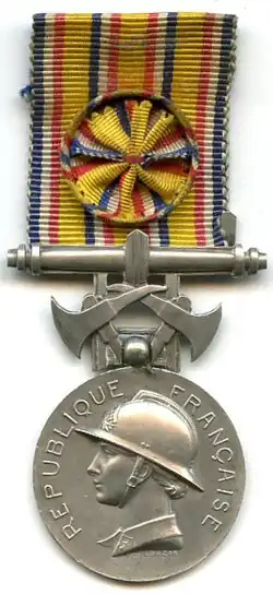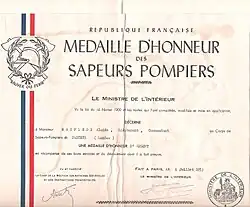 The Honour medal for firefighters (French: "Médaille d'honneur des Sapeurs Pompiers") is a state decoration of France bestowed by the Ministry of the Interior to members of the French Fire Service.[2]