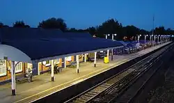 Hook railway station serves the large village of Hook and surrounding villages in Hampshire, southern England. it has two platforms, which serve the outer pair of tracks. The centre pair of tracks has no platforms, and is used by services that do not call at Hook.