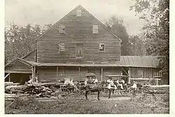 Hooks Mill, West Virginia, 1903 -- Saw and lumber mill, waterpower on left; grain was ground on imported stones from France; the post office was on the right. Flour ground from wheat at the mill was stored on the second floor, hay stored on the third floor. Henson Hook, the mill owner, can be seen dressed in white shirt with hand on front wheel of wagon.