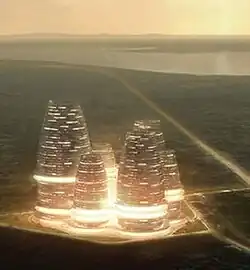 The project was designed by Paolo Brescia and Tommaso Principi of the Italian architectural firm Open Building Research.[2][9] The architectural design is based on the traditional round house unit predominantly found in the three northern regions of Ghana. The technology park will have six towers units. The tallest will have seventy five floors with a height of over 270 metres and will be the tallest building on the African continent. Two of the towers will have sixty floors and be 216 metres tall, and the remaining three towers will have forty-two floors and be 152 metres tall. The six towers will share link bridges on various floors to facilitate movement from between towers.[2]