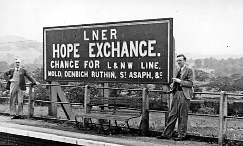 Hope Exchange railway station was located to the west of Penyffordd, Flintshire. The station was in fields with no road access, being an interchange between two lines. The high level section of the station opened on 18 November 1867 on the Wrexham, Mold and Connah's Quay Railway,[1] and the low level section opened on the same day, on the London and North Western Railway.[2] The high level platforms served what is now the Borderlands Line, and the low level platforms served the Mold Railway. The railway line to Hope Low Level was completely removed by 1982. The railway through Hope High Level remains in use as the Borderlands Line. The platforms on the Borderlands Line are still extant whereas the Mold Line ones have been demolished.