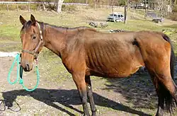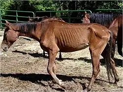 Thinness can have many causes. In geriatric horses, it may be due to parasite infestation. Furthermore, they tend to become thinner and more sensitive to the passing of the seasons,[30] losing weight and body fat.[31] These weight losses can have multiple causes: deficiencies, dental problems, lack of appetite, digestive problems, etc.[32] They are an aggravating factor in horse mortality. They are an aggravating factor in mortality. It's hard to get an old horse to put on weight again.[33] The problem of losing weight can cause problems for owners of older horses, who are sometimes wrongly suspected of animal abuse.[34] Indeed, most animal protection associations consider thinness to be a sign of horse abuse.[35] Numerous cases of mistreatment have involved owners who have fed their animals poorly (or not at all), with the result that they have been found in a state of emaciation that is sometimes considerable.[36]