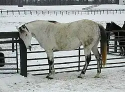 Horses are almost always fatter in summer than in winter,[11] especially if they live outdoors all year round,[12] or in the wild.[13] In summer, changes in light levels lead to an increase in appetite and changes in metabolism,[14][15] which generally result in weight gain. In winter, on the other hand, appetite is reduced and the efficiency of energy conservation is increased, as the food available is generally scarcer.[16] This particularity seems to stem from the horse's long evolutionary history in an environment that does not always offer the same quantity of food from one season to the next, nor from one year to the next.[15] The obesity rate can differ by around 8% depending on whether measurements are taken in summer or winter. The horse body condition is at its lowest at the end of winter.[12]
