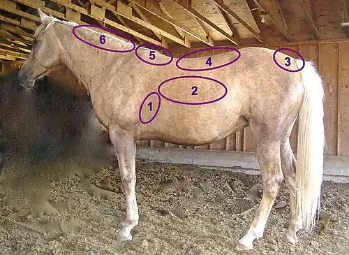 The areas where fat is deposited in horses, enabling body condition to be assessed by palpation: 1. Behind the shoulder; 2. On the ribs; 3. At the tail head; 4. Along the dorsal vertebrae; 5. Around the withers; 6. Along the neck.