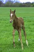 Foal growth leads to particularly rapid weight gain in the first few months. At birth, foals weigh 8 to 12% of their mother's live weight. They double their birth weight during their first month of life. By the time they reach weaning age, at around 6 or 7 months, their weight has quintupled. By the age of one, they have reached around 65% of their adult weight and 90% of their adult height, which explains the often gangly appearance of foals at this age.[10] Draft foals fattened for slaughter weigh on average 59.3% of the adult horse's live weight at 8 months, then 70.1% at 12 months, and 90.1% at 30 months.[2]