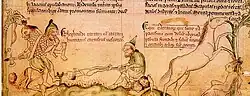 In Mongolian epics, horses save their riders in battle and even fight alongside of them. When Jangar is struck with a poisoned arrow, Aranjagaan realizes what has happened and carefully carries Jangar to safety. To keep his swaying master from toppling off, the horse skillfully leans back and forth, even going so far as to crouching down his forelegs or hindlegs when ascending and descending hills to keep his back level. When they arrive at a house, he lays down to let his rider gently fall off. On another occasion, Aranjagaan runs to a place where a battle is occurring and begins to fight, riderless, alongside the hero. During fights, the epic narrative typically switches back and forth between describing the combat of riders and the actions of their horses, i.e. the hero throws a spear, then the hero's horse lunges forward to pursue an enemy. In battles, the poets describe the horse as a self-willed actor. There are few descriptions of rein-pulling or leg guidance; rather, the impression is that the horse chooses how best to carry on the fight as it works in concert with its rider. The horses bite and kick enemies, and will even bite enemy horses. During a battle, Sanale's red horse "provided him with inexhaustible power. It kicked the enemies eighteen thousand times from the left and then eighteen thousand times from the right so that the spears, broadswords, and arrows were broken. It fought like a huge eagle extending its wings."[47] Horses can be wounded. In a long-running battle, Altan Gheej's crimson horse is "beaten black and blue and scabbed all over. With eyes covered by blood, the horse was nearly trapped by the enemy several times. Seeing the situation was urgent, Altan Gheej whipped the horse to the sea and swam for awhile. The blood was cleaned and the wounds healed up magically."[47] The horses are eager for battle. When Hongor's livid horse sees Hongor equipped for war, it kicks and snorts with excitement.