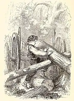 At age twelve, Grant's father sent him into the forest with a team of horses and a wagon to pick up a load of timber. The men at the lumber camp were supposed to load the wagon but were nowhere to be found when Grant arrived. Not wanting to return empty-handed, Grant devised a method by hitching the logs and pulling them aboard the wagon one at a time using the horses. After securing the load, Grant hitched the team back to the wagon and returned home, which amazed his father.[1][16] Biographer James McClure described Grant's "remarkable self-possession of mind" on an occasion when he was transporting two women in a two-horse wagon across a creek swollen from heavy rain, where he found the water level much deeper than usual. Upon crossing, he suddenly found the water to be so deep that the horses were almost swimming, while the water was up to the wagon's deck level. The women became greatly alarmed and began to scream, but Grant, though in a very precarious situation, remained calm, looked over his shoulder, and assured the ladies by saying, "Don't speak, I will take you through safely," and continued on without further incident.[15][17]
