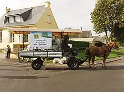 In 1948, the Breton departments were among the richest in horses. There were 19 horses per square kilometer in Finistère, 13 in Côtes-du-Nord, 11 in Ille-et-Vilaine and 7 in Morbihan.[148] One of Brittany's particularities is that it has maintained a high level of horse breeding later than other regions of France. Local markets are enough for breeders to survive. Until the 1960s, horses continued to be bred and exported in a way that was considered anachronistic.[149] From the 1950s onwards, demand for horses declined sharply.[150] Breeders in Brittany moved closer to their breeding syndicate and the national stud farms in the 1960s and 1970s, when motorized farming meant that only breeding premiums and agricultural competitions could sustain them.[149] Breeding for the meat market gave a new lease of life to the Breton breed, particularly through exports to the Italian market.[149] Conversion to meat production is difficult for some breeders and for the horses, which tend to become "fat" due to lack of work in the fields:[151] breeding horses for meat is not part of Breton tradition. Vegetable farmers in the Pays de Léon are among the last to abandon horses for work.[152] In 2012, there were only around 30 farms using horses for agricultural purposes.[153] Breed shows are replacing the fairs of yesteryear, where horses are carefully groomed with raffia.[154] The tradition of tail docking (caudectomy), to prevent the appendage getting caught in reins or harnesses, lives on.[155] There is, however, at least one biennial ploughing competition in Finistère.[156][157]