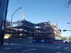 Phase 1 completion is expected in late 2023.[59] Preliminary work included removal of the pathways and bridges connecting the two sides of Jerde's diagonal "armature", leaving a clear view from end to end.[60] This phase renovates and expands the former Nordstrom and Mervyn's buildings on the southwest and west ends, respectively. The former Nordstrom, now known as Building A, will have 389,000 sq ft (36,100 m2) of space for life science tenants on 10 floors, expanded from five floors as originally completed. The former Mervyn's will have 205,000 sq ft (19,000 m2) of office space and 51,000 sq ft (4,700 m2) of retail space. Phase 2 will be completed at an undetermined date, and encompasses the former Macy's and cinema spaces.[61]