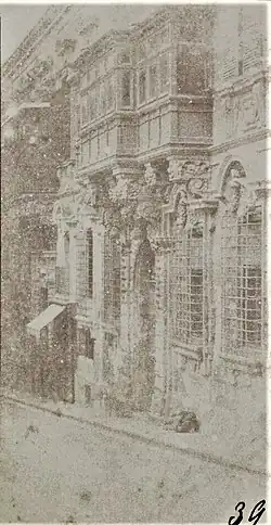 The Hostel de Verdelin is an early example of Baroque architecture in Malta.[21] Its ornate façade has significant influences from the Spanish Baroque style, which is unusual in Malta, where Italian and French Baroque are more common.[8] Its façade is said to be one of the finest in Valletta[22] and described as being an impressive example of artistic fabric in urban Malta.[23] The ornate windows are the centerpiece of the façade.[24] In the 19th century, during the British period, closed timber balconies replaced earlier structure[4] that originally consisted of stone balconies.[25] An artistic interpretation of de Verdelin in form of a painting is found within the building.[26] The palace is the largest of three adjacent buildings which belonged to Verdelin.[7]