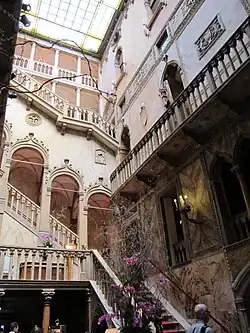 The 14th-century building which has been a hotel since 1822 now has a pink façade with marble sills, white turrets and balconies with pointed arches.[9] The main architectural feature is the four-storied courtyard which is covered with arches in Venetian Gothic style and provides for natural sunlight. The foyer leads to the open staircases with balustrades up to the furnished rooms and suites. While an elevator is available, the stairway is painted gold. The hotel's 204 rooms and suites are spread through a central building with three wings.[16] There are rooms facing the lagoon in the original wing of the hotel and large rooms in the 19th-century palazzo.[5] The hotel also boasts a huge fireplace.[16]