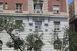 The design of the base along 103rd Street is similar to on Broadway, except that the ground slopes up from east to west, and there is a recessed areaway in front of the ground story.[16] There is an iron fence in front of the areaway, which was replaced at some point in the 20th century.[17] The original main entrance to the building is in the central bay on 103rd Street, on the second story,[16] through an arch measuring 15 feet (4.6 m) tall.[18] The entrance is flanked by Tuscan-style fluted columns with bands, and there is an ornate entablature above the columns. In addition, a cartouche with mask and swag motifs is placed above the entrance. The bays directly next to the entrance are arched and contain rectangular panes with an oculus above them. On the third through seventh stories, the window in the central bay is flanked by slit windows. The upper stories are similar in design to the Broadway facade.[16]