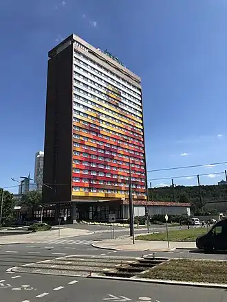 The Hotel Olympik was designed by a team of architects led by Josef Polak between 1967 and 1971.[4] The hotel was opened to the public in 1973. The building is 73 metres (240 ft) high, it has 21 floors and overlooks the city quarter Karlín.[5]