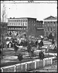 The White Hall Inn, located in present-day West End, Atlanta, is generally considered to be one of the first hotels in the area, predating the founding of the city by several years and laying outside the original city limits.[1] As the area's population began to grow following its establishment as a terminus for the Western and Atlantic Railroad in 1837, several hotels arose to service visitors to the city. The first hotel built within city limits came in 1846 with the construction of the Atlanta Hotel.[2] It was joined later that year by Washington Hall.[3] Several more hotels would follow, including the Trout House in 1849.[4] However, these buildings, as well as many other Antebellum era buildings in the city, were destroyed during the Burning of Atlanta, a significant event preceding Sherman's March to the Sea during the American Civil War.[5]
