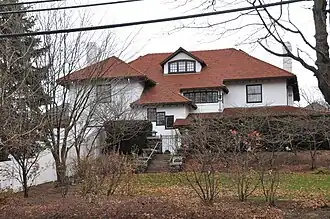Boit's three houses were designed by local architect Harland Perkins. They were situated in an estate compound on the summit of Cowdry's Hill, that included three residences, formal gardens, a playhouse, and a greenhouse. All three residences, 90 and 88 Prospect Street, and 127 Chestnut Street (1910-1913), were designed in the English Cottage style. The stucco structures have red tile roofs, recessed entries, exposed purlins, and irregular fenestration. This house is 1+12 stories in height, with its entry set under a cross-gable roof section with a clipped gable. There are recessed porches on either side, supported by heavy columns.[3]