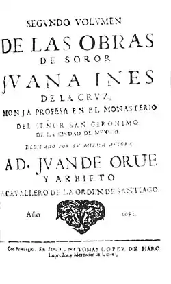 - Segundo tomo de las obras de sóror Juana Inés de la Cruz, monja profesa en el monasterio del señor San Jeronimo de la Ciudad de México, dedicado por la autora a D. Juan de Orúe y Orbieto, caballero de la Orden de Santiago. Sevilla, Tomás López de Haro, 1692. Reprinted in Barcelona, 1693 (tres ediciones). With the title Poetic Works, Madrid: 1715 and 1725. Including the auto sacramentales, la Athenagoric Letter, The Efforts of A House and Seventy More Poems.[47]