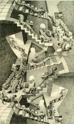 House of Stairs is a lithograph print by the Dutch artist M. C. Escher first printed in November 1951. This print measures 47 cm × 24 cm (18+5⁄8 in × 9+3⁄8 in). It depicts the interior of a tall structure crisscrossed with stairs and doorways.