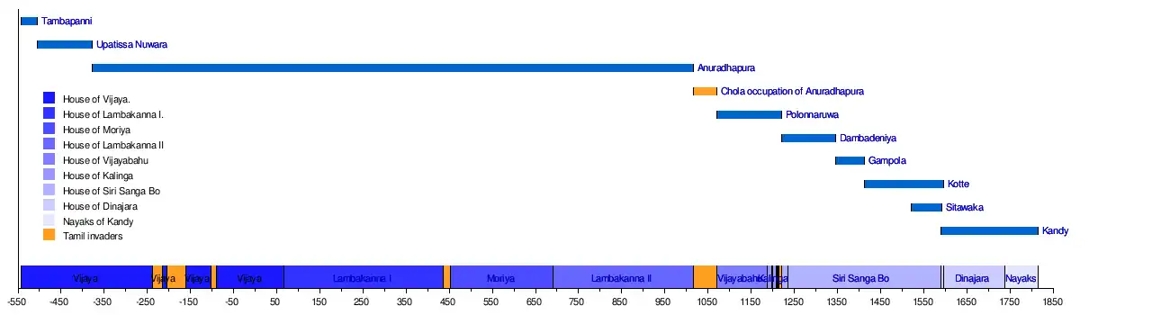 The House of Vijaya (also known as the Vijayan dynasty and sometimes referred to as the "Great Dynasty") was the first recorded Sinhalese royal dynasty that ruled over the island, Sri Lanka. According to Sri Lankan folklore, Prince Vijaya is the traditional first king of Sri Lanka, founding the Kingdom of Tambapanni and the dynasty subsequently founding the Kingdom of Upatissa Nuwara and finally the Anuradhapura Kingdom.[2][3][4]
