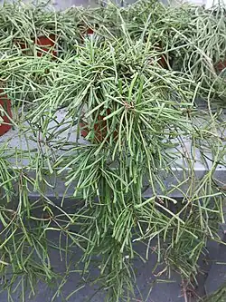 Hoya retusa grows in clumps with long stems hanging downwards. It grows in a trailing habit and the foliage is succulent.[4] The leaves arise in clusters. The flowers are fragrant, star-shaped having creamy petals and red corona at center.[5]