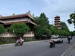 On Phật Đản, thousands of Buddhists defied the ban on flag-flying. More than 500 people marched across the Perfume River, carrying signs and placards, congregating at the Từ Đàm Pagoda before a 3,000-strong demonstration, calling for religious equality, took place in the city centre as government security officials surrounded the area with armoured personnel carriers and civil guardsmen. The signs were in English, to convey the message to Western observers, and in Vietnamese. Despite the ban on religious flags, Vatican flags hoisted on the bridge from the Catholic celebration were never taken down.[22] The leading Buddhist activist monk Thích Trí Quang addressed the crowd and exhorted them to rise up against Catholic discrimination against Buddhism. He called the Buddhists to congregate outside the government radio station in the evening for a rally. Tension increased throughout the day with demonstrators chanting and displaying anti-government slogans as the crowd grew. They expected to hear another speech from Thích Trí Quang, but the speech was withdrawn from broadcast by the government censor. The armed forces were called in to disperse the discontented crowd. After two explosions shook the ground, the crowd thought that the troops had resorted to using bombs. Major Sỹ reportedly fired into the air, and his men responded by launching grenades into the crowd as firehoses were unleashed on the demonstrators. His troops fired directly into the crowd. Nine were killed and four severely injured. Two of the dead, both children, had been crushed underneath armored personnel carriers. Some of the nine had been mutilated and decapitated.[23][24]